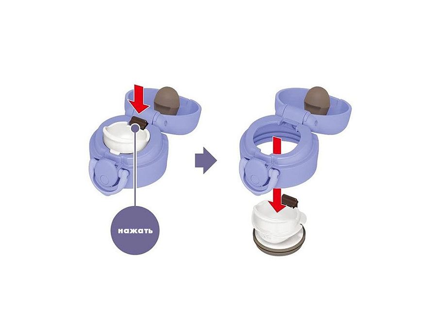Оригинальная конструкция крышки-пробки позволяет пить из термоса даже на ходу – удобный поильник с небольшим выливным отверстием предотвратит расплёскивание напитка при движении, позволяя контролировать поток жидкости. Термос открывается одной рукой (левой или правой): при нажатии на кнопку верхняя крышка автоматические откидывается на 180 градусов, фиксируется в открытом положении и не опрокидывается при питье.