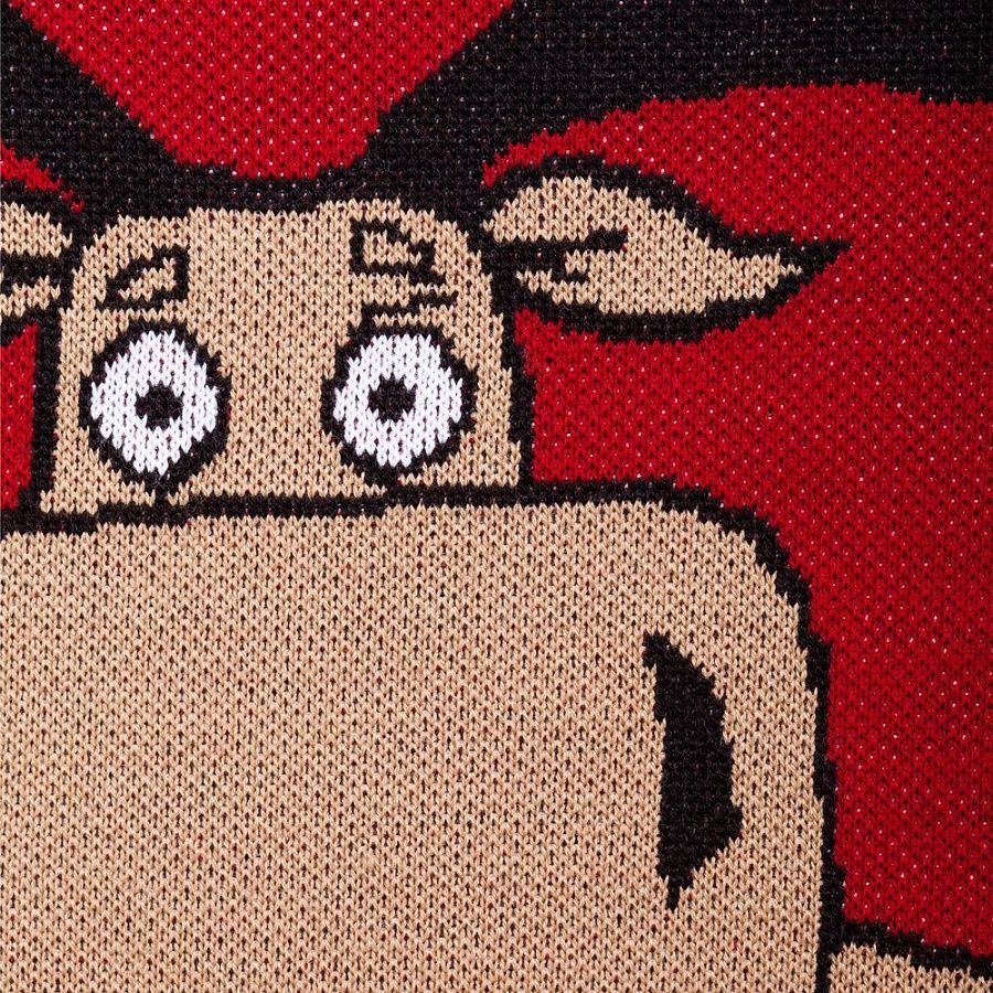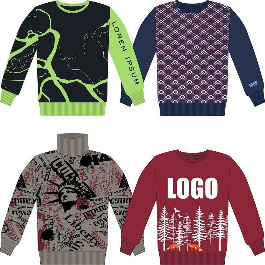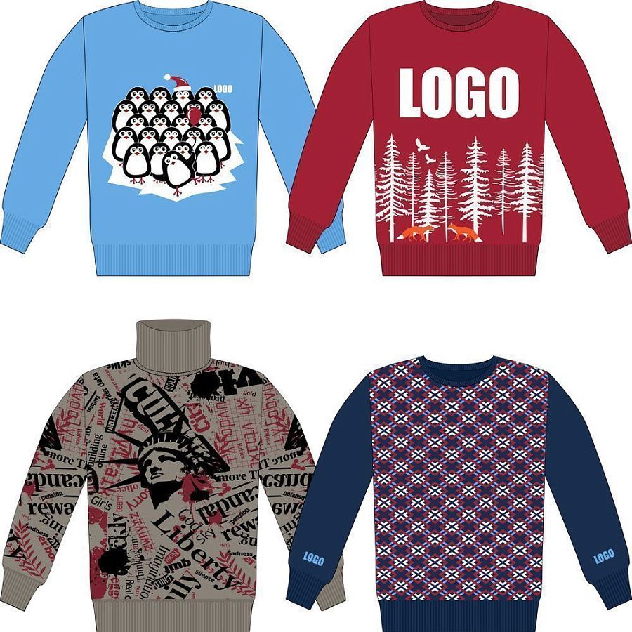 Свитер с вывязанным логотипом и индивидуальным рисунком в фирменной цветовой гамме.