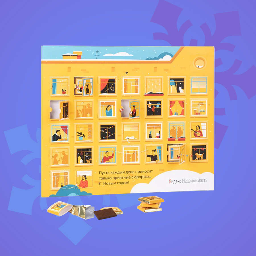 Шоколадный Адвент-календарь с плитками на месяц изготавливается на заказ по индивидуальному макету и вашим пожеланиям. По мимо классических видов шоколад есть так же возможность изготовить набор с любым даже экзотическими видами шоколада. Шоколадные плитки в наборе упакованы в фольгу, цвет которой вы можете выбрать из нашего широкого ассортимента, поверх фольги плитка упакована в индивидуальную этикетку, так же с брендированием.