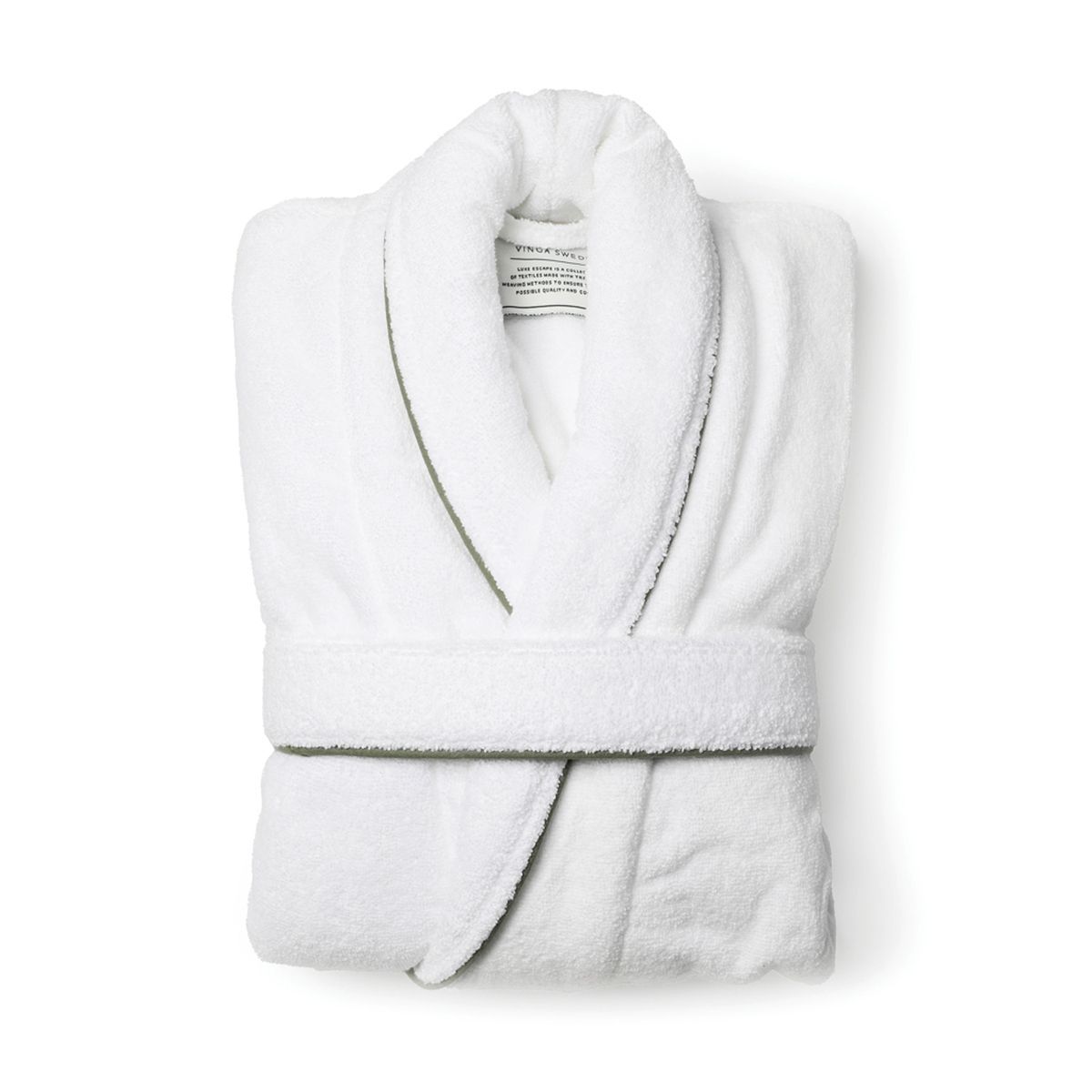 Халат VINGA Harper — это классическая модель унисекс с широким воротником и длинным поясом. Для большего комфорта мы сделали швы закрытыми, а для стильного внешнего вида добавили контрастную окантовку. Халат изготовлен из стопроцентного хлопка: благодаря длинному хлопковому волокну с некручеными нитями материал получается очень мягким и приятным на ощупь. Банный халат из хлопка — лучшее решение, поскольку это гипоаллергенный долговечный материал, который быстро впитывает влагу и хорошо держит форму.