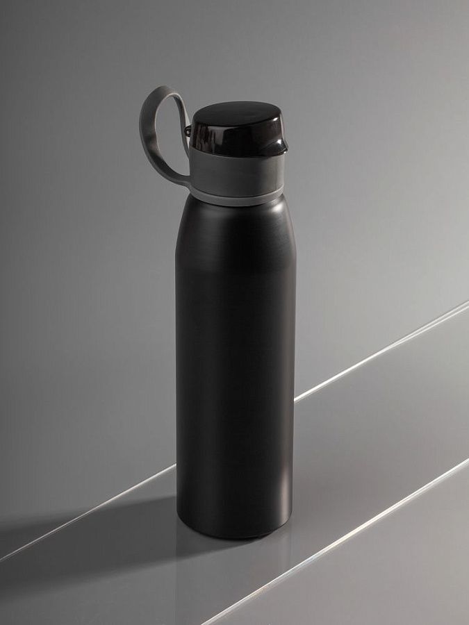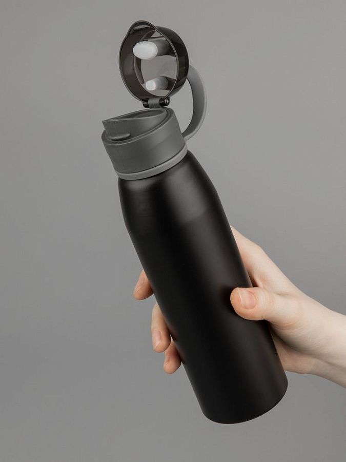 Легкая бутылка для спорта с откидной крышкой и силиконовой петлей для удобной транспортировки.