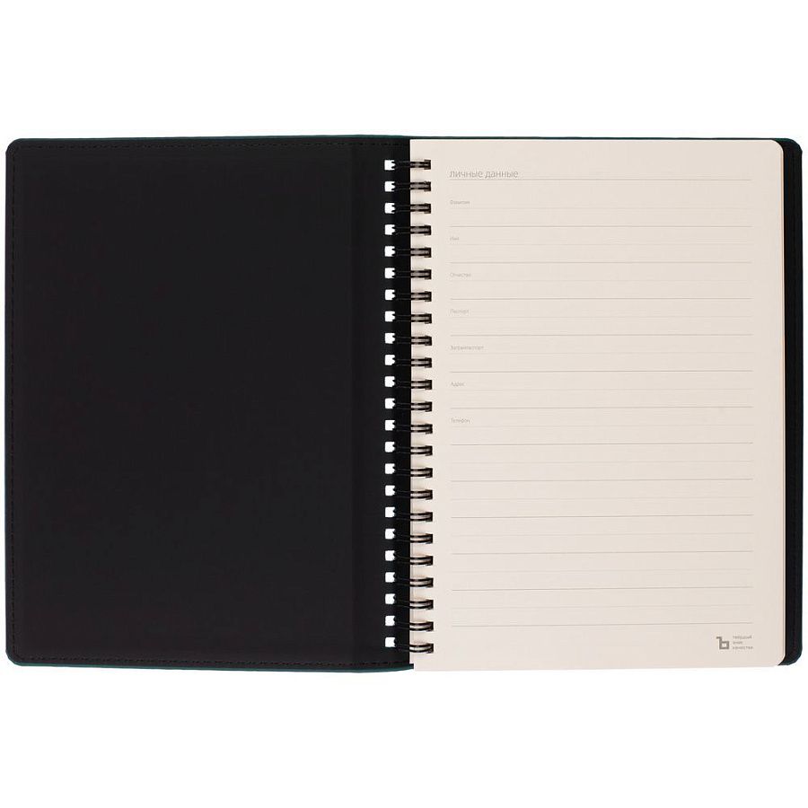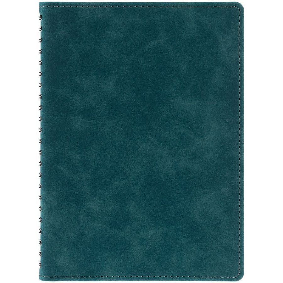 Ежедневник с блоком на пружине в твердой обложке, выполнен из материалов Nubuk Touch, темно-зеленый VV и Soft Touch, черный AA.
