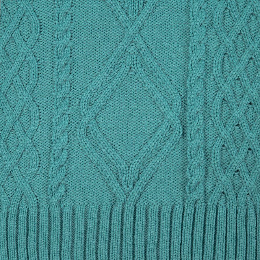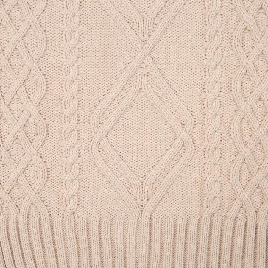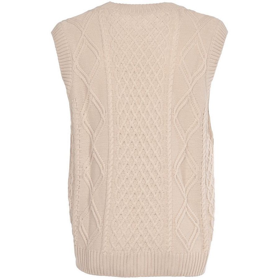 Модель: однотонный жилет крупной вязки с узорами в виде кос. Силуэт оверсайз, спущенное плечо.