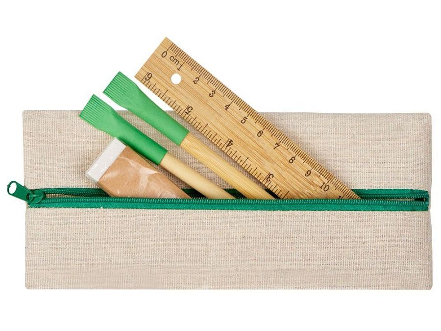 Удобный набор канцелярии со всем необходимым. В наборе: пенал на молнии, ручка Recycled, вечный карандаш в бамбуковом корпусе с колпачком из переработанной бумаги, ластик и бамбуковая линейка. Чтобы все самые необходимые пишущие принадлежности были под рукой.