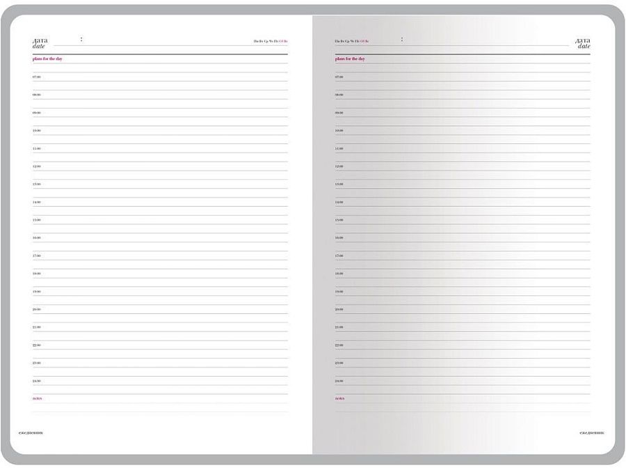 В ежедневнике «Sidney Nebraska» есть полезная справочная информация и телефонная книга на 18 листов, а также 272 страницы для записи идей, мыслей и составления рабочих планов. Специально для ежедневных офисных дел в ежедневнике используется качественная белая бумага плотностью 70 г/м². Разметка блока с указанием времени позволяет планировать дела с точностью до 1 часа.