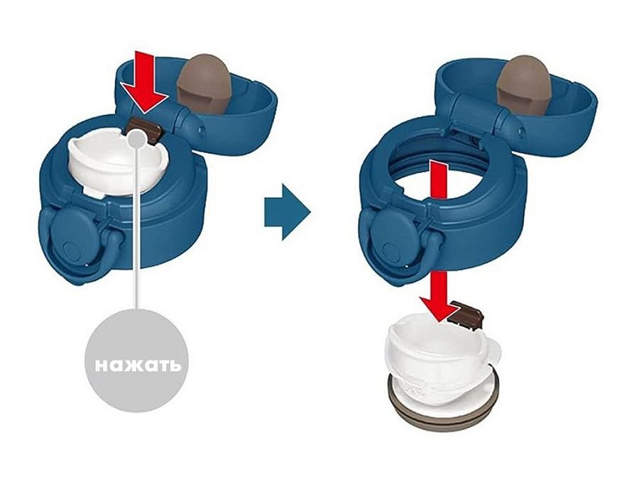 Термокружку можно быстро открыть одной рукой лёгким нажатием на кнопку - верхняя крышка откидывается на 180 градусов, фиксируется в открытом положении и не опрокидывается при питье.