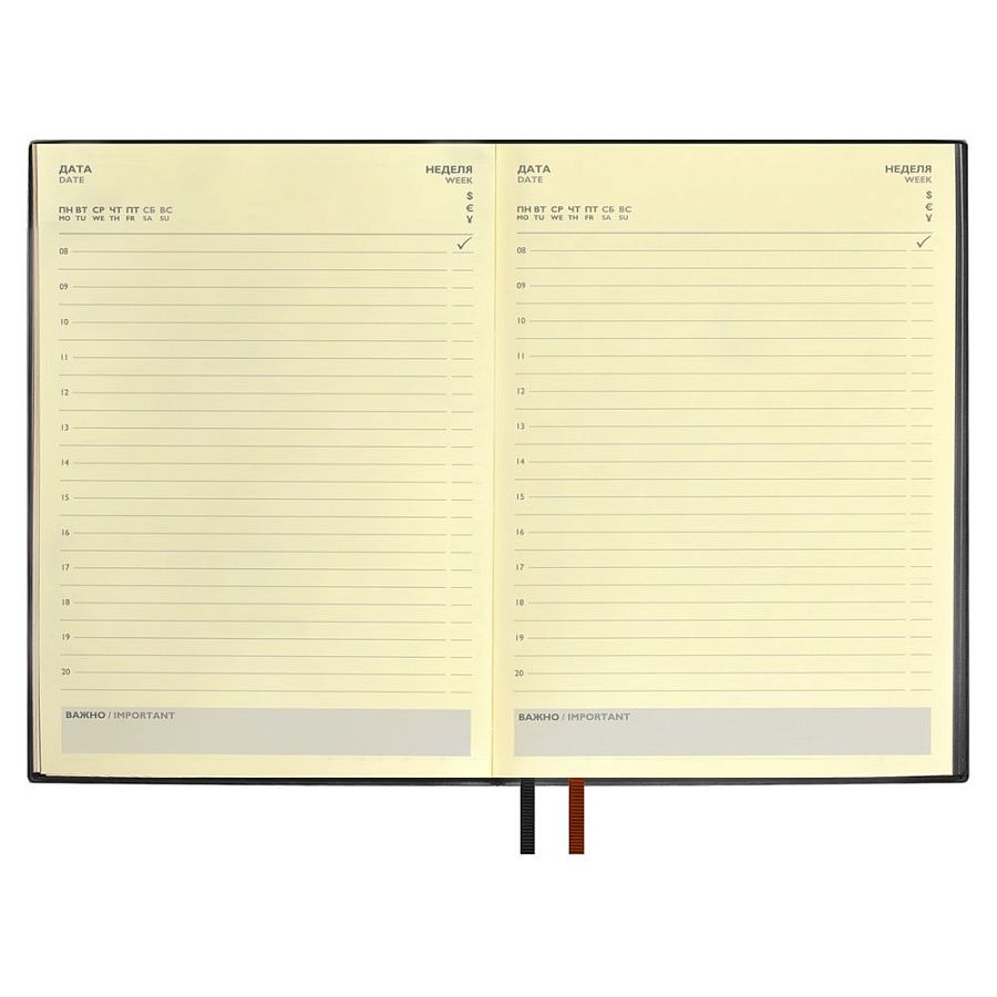 Ежедневник с гибкой обложкой и закладкой из искусственной кожи, дополнен капталом и двойным ляссе.
