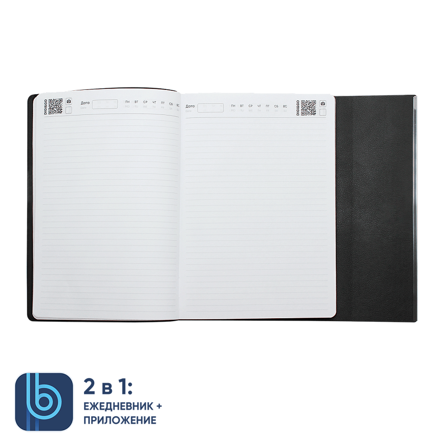 DIGI– фотоснимок страницы ежедневника. На каждой странице ежедневника расположен QR код, который открывает режим камеры сразу в приложении. Остается только нажать кнопку.