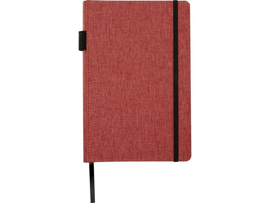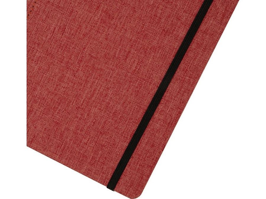 Блокнот формата А5 с отделкой из переработанного ПЭТ. Содержит 96 листов в линию плотностью 70 г/м², изготовленных из переработанной бумаги, с петлей для ручки и лентой-закладкой. В упаковке из картона.