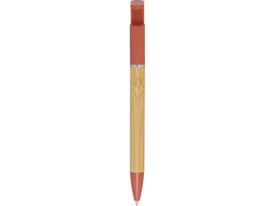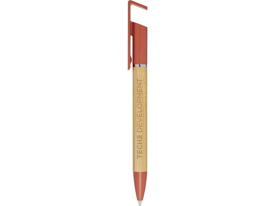 Бамбуковая шариковая ручка, которая также может служить подставкой для телефона. Кнопка и среднее кольцо изготовлены из переработанного пластика, наконечник — из латуни, а корпус — из бамбука, полученного из ответственных источников. Цвет чернил: черный. Длина непрерывной линии: 1000 метров. Размер пера: 1,0 мм. FSC certified bamboo. FSC Mix Credit N5 CU-COC-877277.