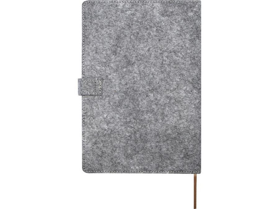 Блокнот формата А5 в твердой обложке из переработанного фетра и пробки, 80 листов бумаги плотностью 70 г/м² в линейку. Блокнот имеет 3 кармана для визиток, коричневую ленту в тон и закругленные углы. FSC certified paper, RPET felt, FSC certified cork. FSC Mix 100% P7.1 CU-COC-877277.