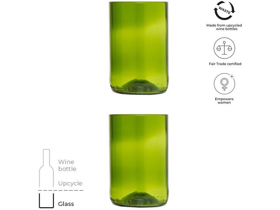Набор из двух бокалов объемом 280 мл, изготовленных из переработанных винных бутылок. Эти стаканы идеально подходят для любого напитка, что делает их идеальными вариантом как для повседневного использования, так и для особых случаев. Переработанное стекло.