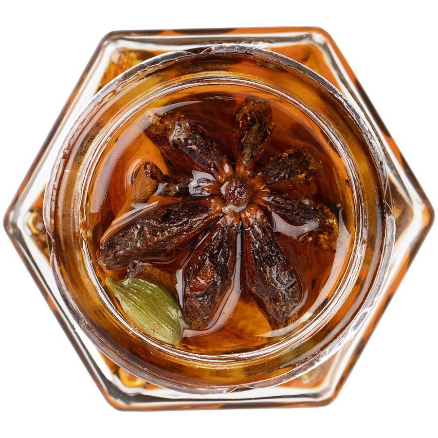 В состав входят специи, традиционно используемые для приготовления глинтвейна: корица, сушеный апельсин и лимон, кардамон, бадьян, мускатный орех, душистый перец, гвоздика. Для приготовления пряного напитка достаточно 1 бутылки вина и 1 баночки меда, но вы также можете добавить фрукты и дополнительные ингредиенты по вкусу.