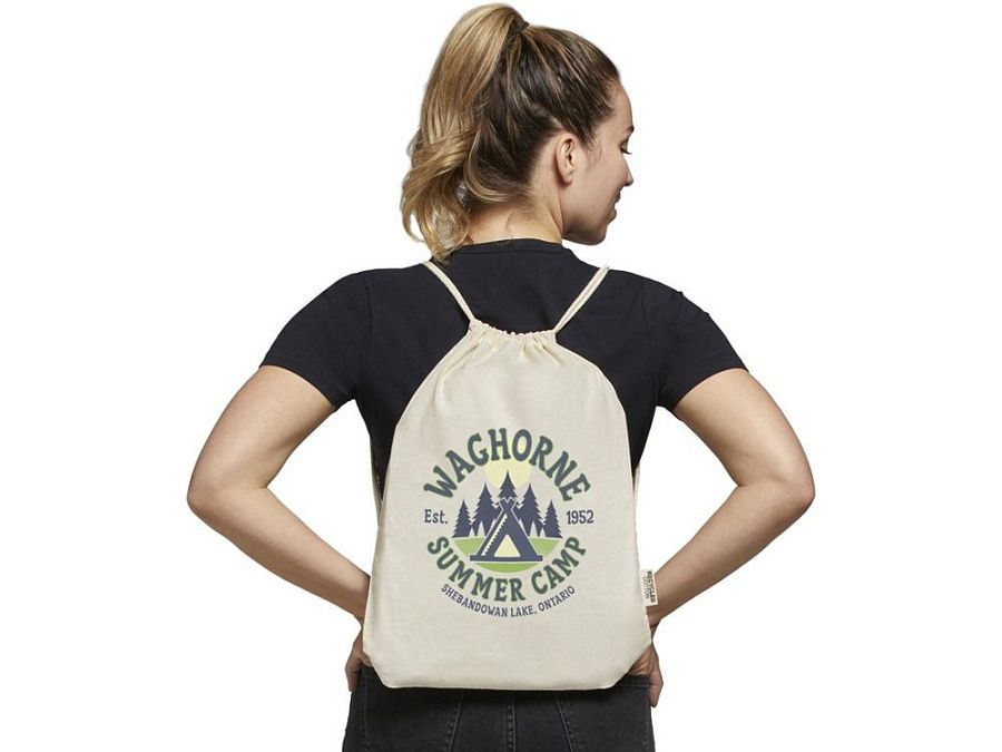 Сумку Oregon на шнурке, изготовленную из 100% переработанного хлопка, сертифицированного GRS, легко преподнести в качестве подарка для продвижения вашего бренда или маркетинговой кампании. Эта легкая сумка недорога, ее легко носить на спине или на плече, и в ней достаточно места для размещения логотипа или других надписей. Шнурок позволяет легко открывать и закрывать сумку, а хлопковый материал плотностью 140 г/м² прочный и долговечный. Большое основное отделение затягивается хлопковым шнурком. Выдерживает вес до 5 кг. GRS certified recycled cotton, 140 g/m2.