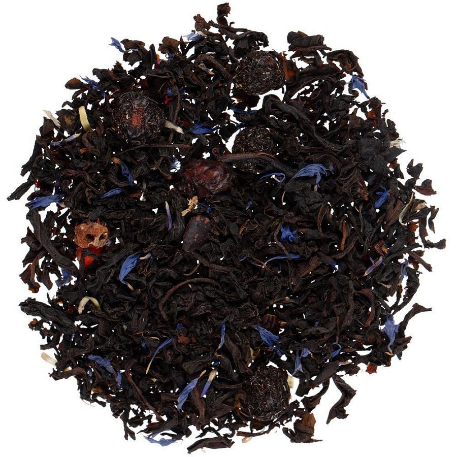 Черный цейлонский чай с ягодами вишни и лепестками василька имеет терпкий насыщенный вкус с цитрусовой кислинкой и сладкими нотками.Состав: чай черный крупнолистовой, вишня черная сушеная, цедра шиповника, лепестки василька, пищевой ароматизатор «Бергамот».