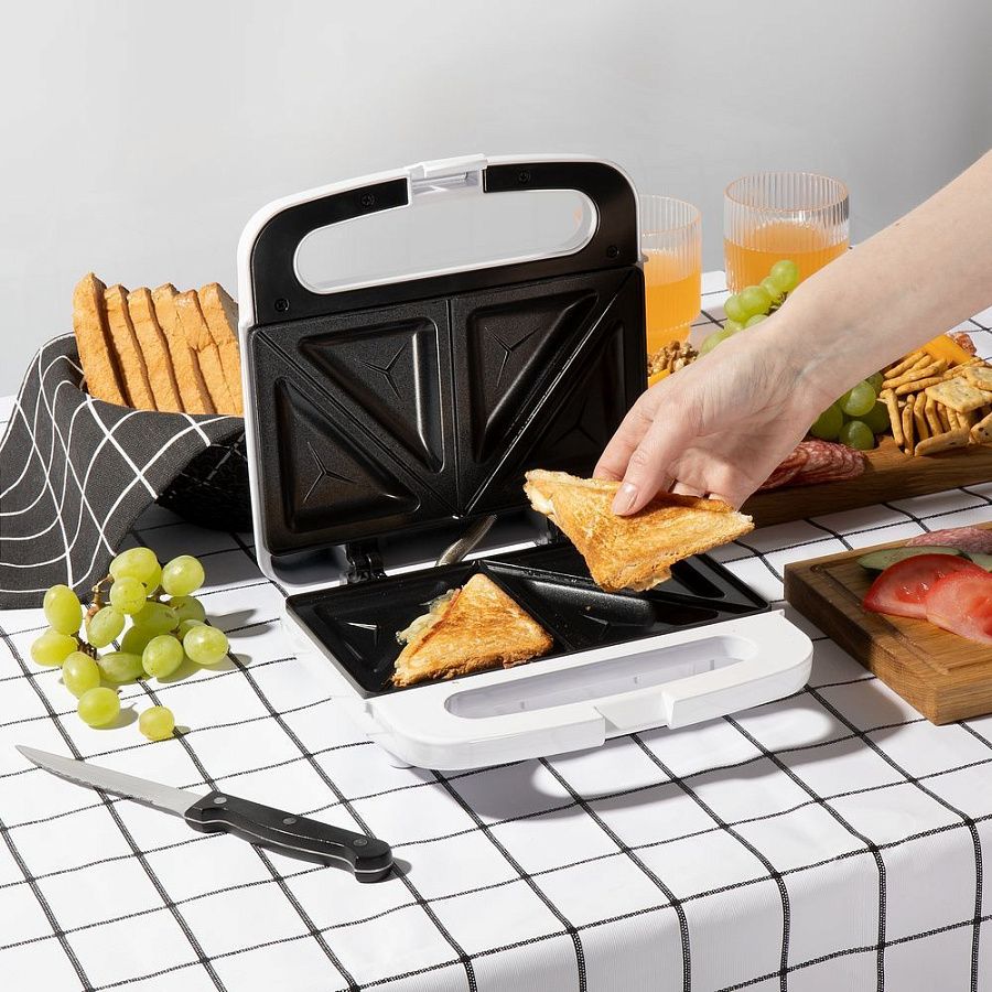 Сэндвичница быстро разогревается и поджаривает бутерброд в считаные минуты. Равномерно прогревающиеся панели с антипригарным покрытием позволяют быстро и качественно приготовить вкусную закуску с разными начинками, а затем легко очистить прибор.