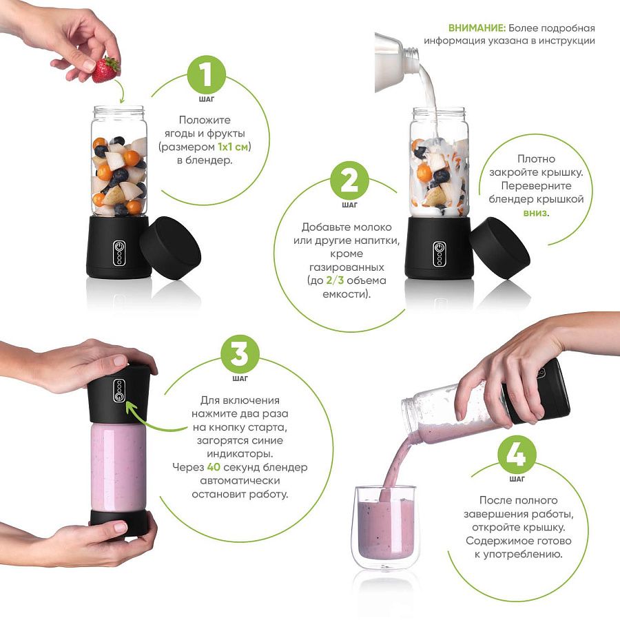 Перед первым использованием вымойте бутылку и основание блендера с помощью мягких моющих средств, далее насухо вытрите. Не оставляйте основание блендера надолго в воде.