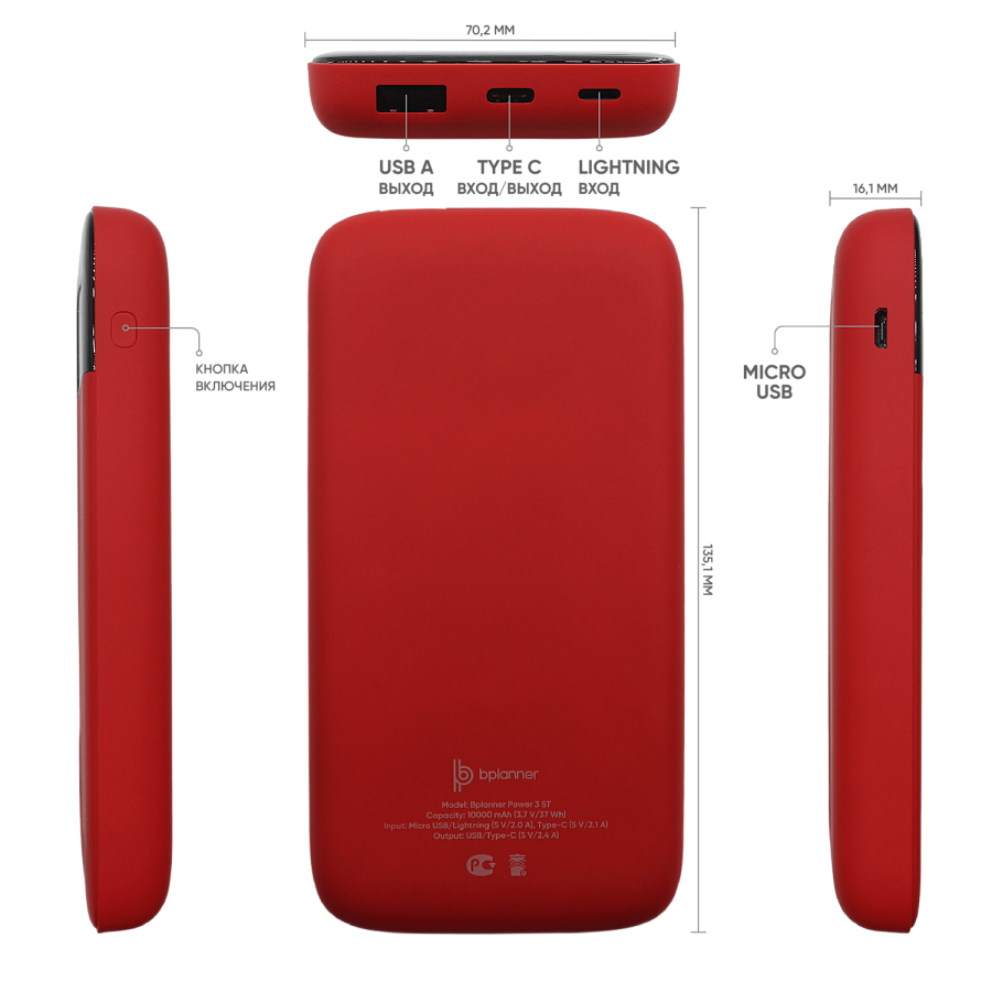 1. Внешний аккумулятор Bplanner Power – функциональное зарядное устройство, которое представлено в различных модификациях и может одновременно заряжать 2 гаджета. Аккумулятор оснащен индикатором заряда и входом Type-С. В комплекте идет кабель 3 в 1 и инструкция.