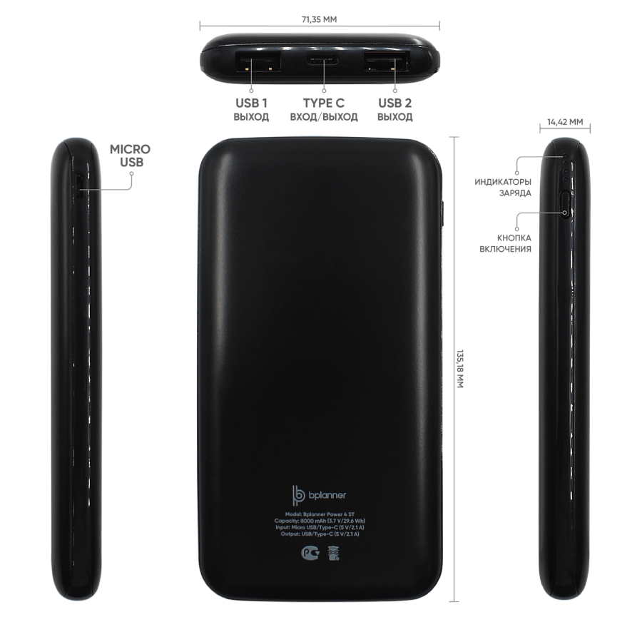 1. Внешний аккумулятор Bplanner Power – функциональное зарядное устройство, которое представлено в различных модификациях и может одновременно заряжать 2 гаджета. Аккумулятор оснащен индикатором заряда и входом Type-С. В комплекте идет кабель 3 в 1 и инструкция.