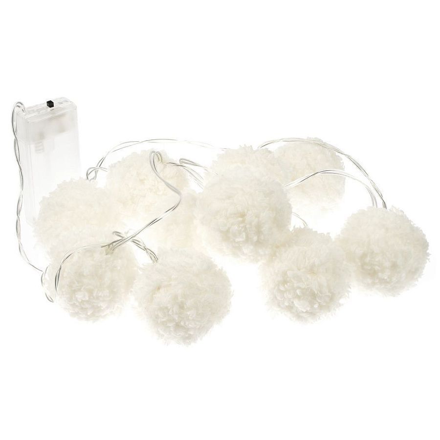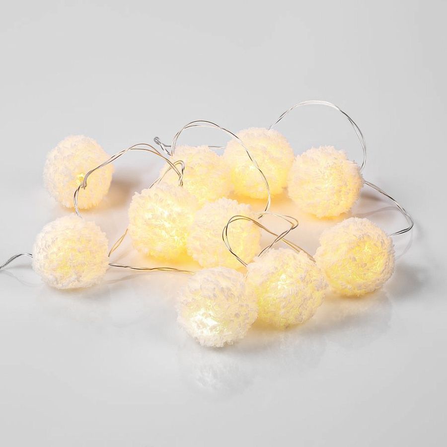 10 пушистых шариков с лампочками теплого света. Работает от 2 батареек АА (в комплект не входят).