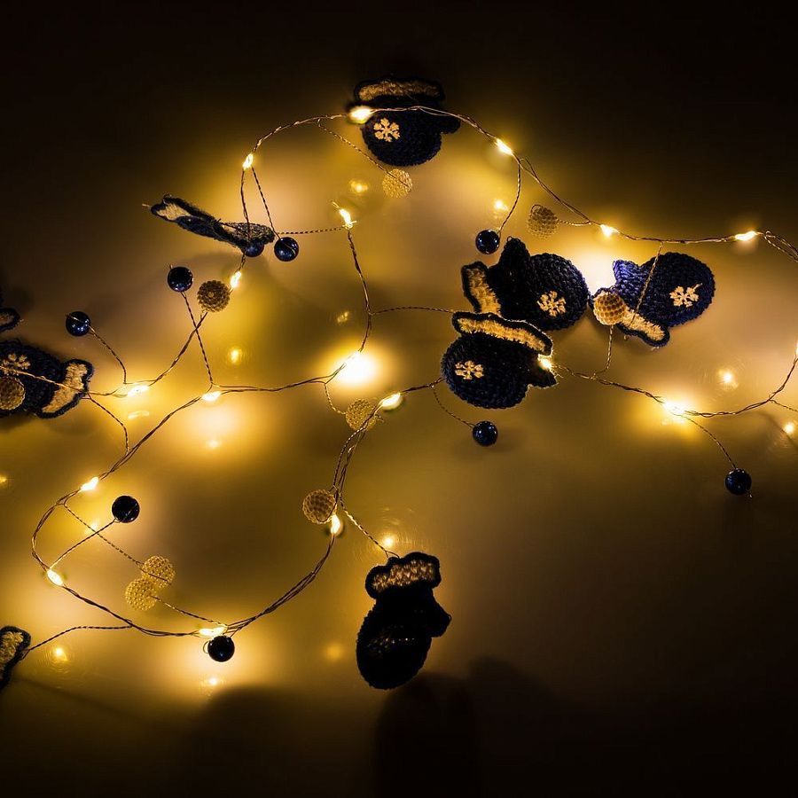 12 варежек, бусины и 20 лампочек с теплым светом. Работает от 2 батареек АА (в комплект не входят).