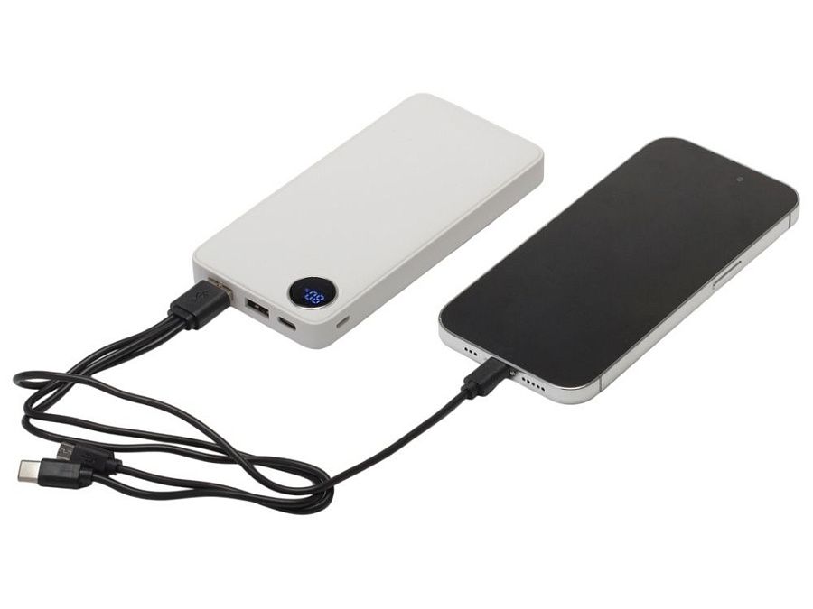 Внешний аккумулятор с новым покрытием металлик soft-touch и цифровым дисплеем. Приятное бархатистое покрытие дополнено эффектом металлического блеска. Обе стороны можно украсить полноцветным УФ изображением. Что касается технической части, 10000 мАч - это самая популярная ёмкость в портативных аккумуляторах , её хватит на 2-3 полных заряда современного смартфона. На фронтальной части расположен цифровой дисплей, показывающий текущий заряд аккумулятора в процентах. При первом включении он может "отставать" от реального заряда аккумулятора, но после первого же цикла разрядки-зарядки повербанка он настроится автоматически. Имеется 2 выходных разъема (USB-A * 2) и 2 входных (USB-C, micro USB). Универсальный кабель 3-в-1 в комплекте (Lightning, micro USB, USB-C). Размер аккумулятора чуть меньше современного смартфона.