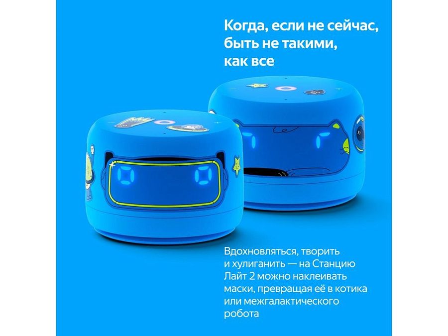 Вдохновляться, творить и хулиганить — на Станцию Лайт 2 можно наклеивать маски, превращая её в котика или межгалактического робота. А стикерами из набора здорово украшать и умную колонку, и всё вокруг.