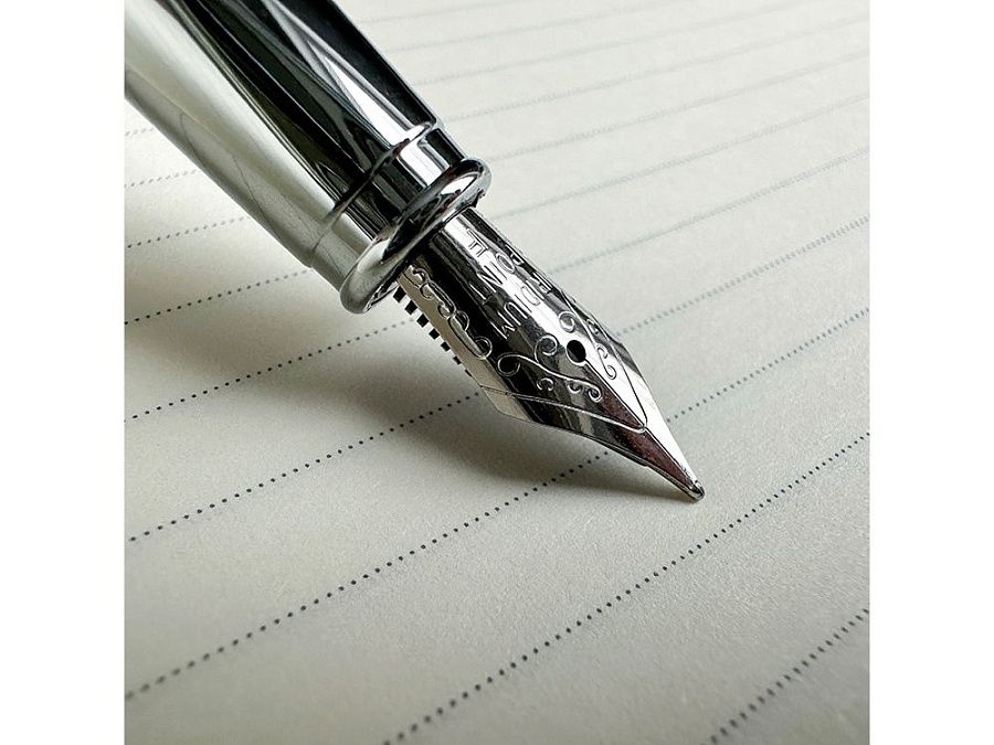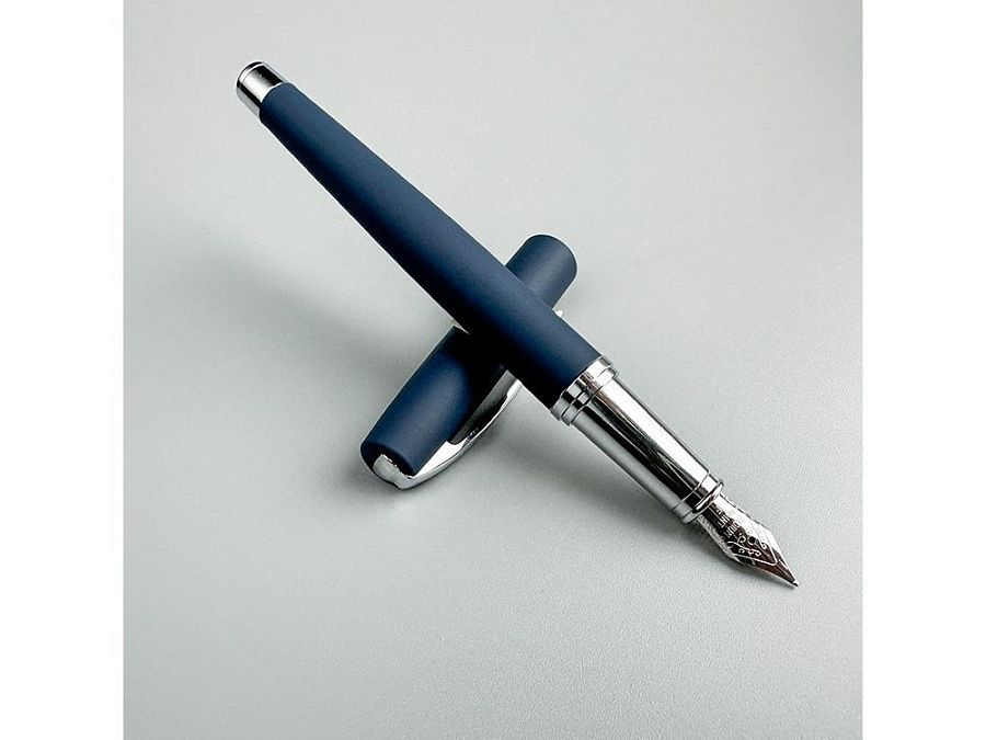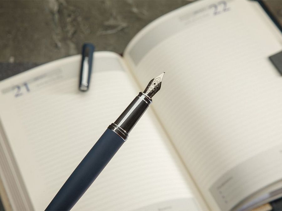 Cтильная перьевая ручка «Sienna» от Bruno Visconti синего цвета с контрастирующими элементами в цвет серебра. Благодаря покрытию Soft Touch пальцы не скользят по корпусу ручки, письмо комфортное и легкое. Ручка оснащена высококачественным механизмом подачи чернил, благодаря которому линия остается однородной и аккуратной. Чернила не токсичны, на основе водорастворимого красителя, не забивают фидер. Перьевой наконечник выполнен из иридиума и дополнен орнаментом.