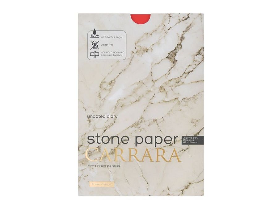 Уникальность недатированного ежедневника Carrara от Bruno Visconti — в его блоке. Он изготовлен из каменной бумаги плотностью 144 г/кв.м, отличающейся особой гладкостью и повышенной прочностью. Она не боится воды и пролитого кофе, достаточно просто протереть сухой салфеткой.
