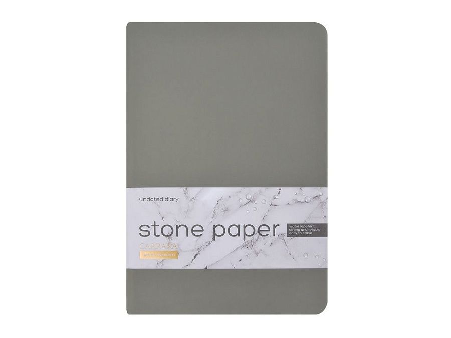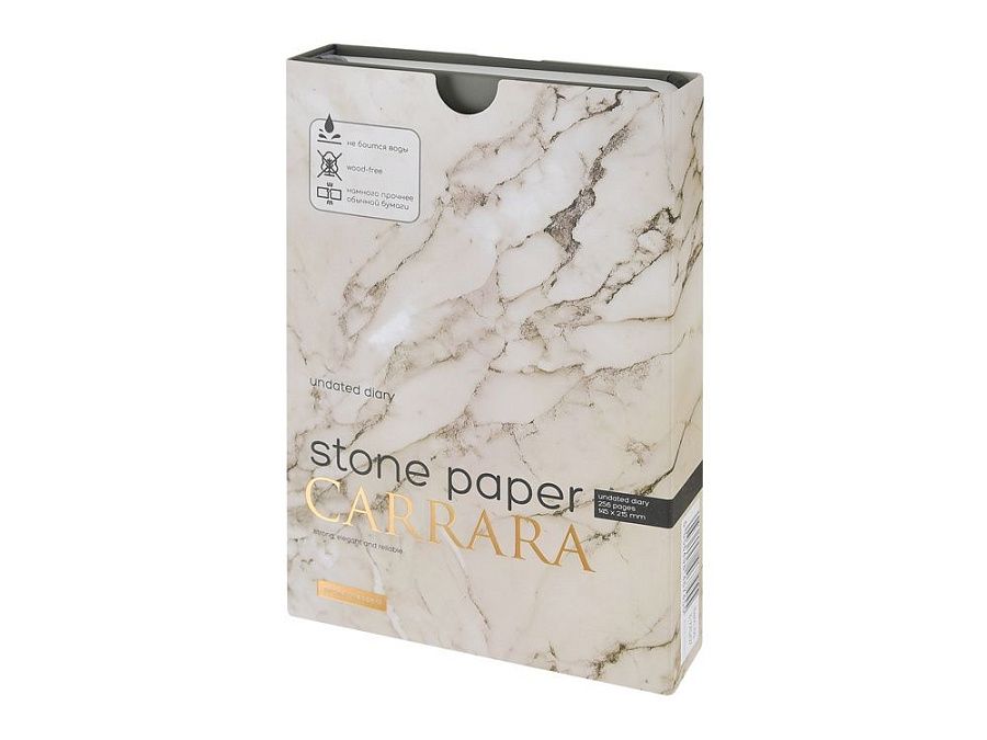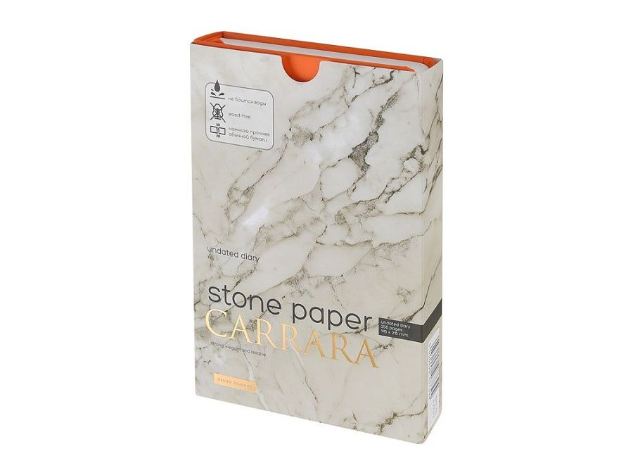 Уникальность недатированного ежедневника Carrara от Bruno Visconti — в его блоке. Он изготовлен из каменной бумаги плотностью 144 г/кв.м, отличающейся особой гладкостью и повышенной прочностью. Она не боится воды и пролитого кофе, достаточно просто протереть сухой салфеткой.