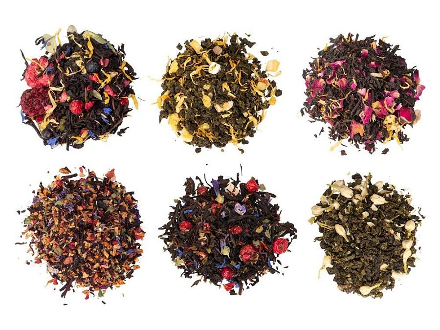 чай манго-маракуйя черный, таежный сбор черный, манговый улун черный, моли хуа с бутонами жасмина зеленый, ягодный пирог травяной, граф Орлов черный
