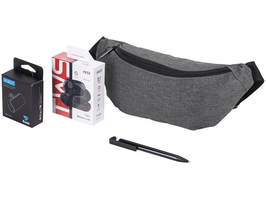 сумка на пояс, ручка шариковая, беспроводные наушники, повербанк