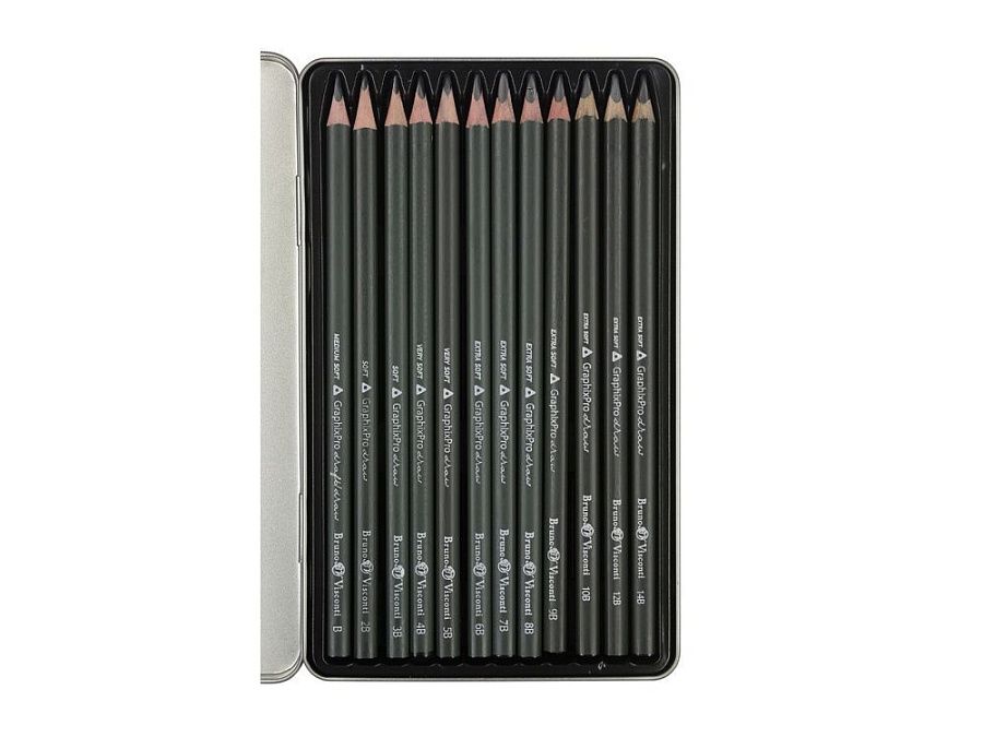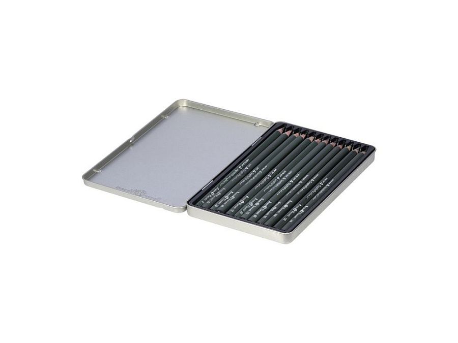 12 карандашей разной твердости (b, 2b, 3b, 4b, 5b, 6b, 7b, 8b, 9b, 10b, 12b, 14b), металлическая коробка