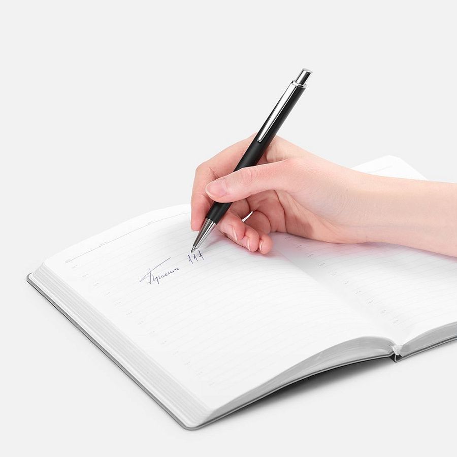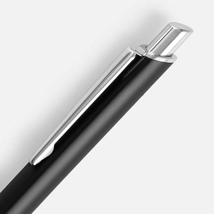 Металлическая ручка с матовым корпусом и хромированными деталями.