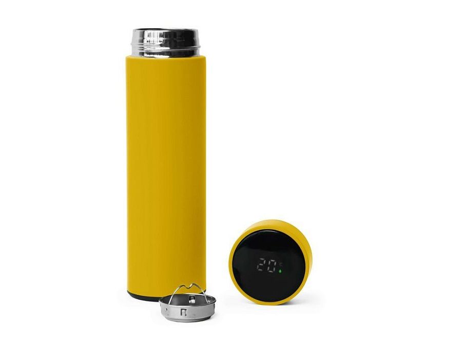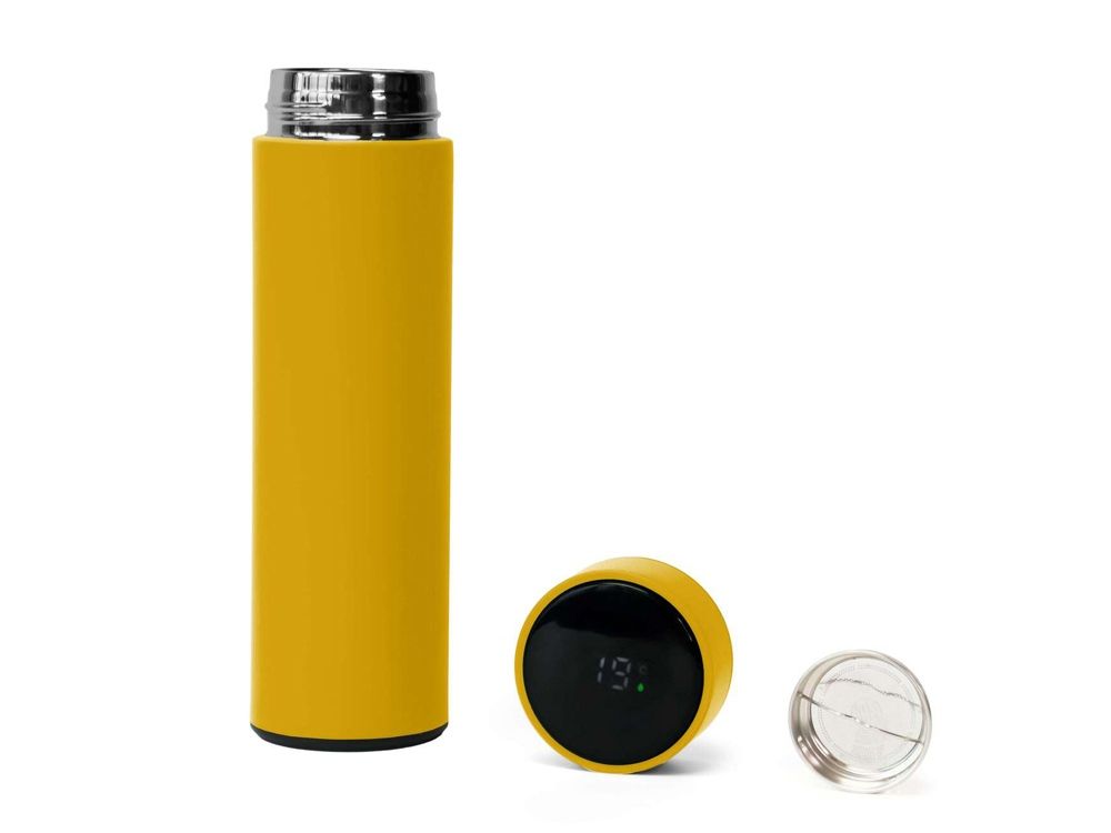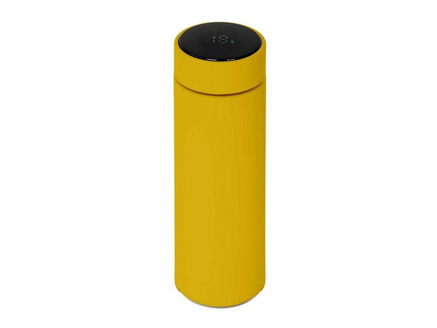 Термос из нержавеющей стали, покрытый цветным soft touch, с крышкой, в которой встроен термометр и LED дисплей, показывающий температуру внутри термоса. Объем: 500 мл. Упаковка: каждый термос в крафт коробке.