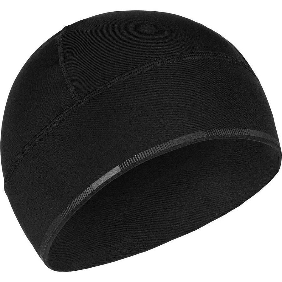 Шапка выполнена в черном цвете, но имеет светоотражающую полосу вдоль края, что улучшает видимость спортсмена в условиях плохой освещенности.