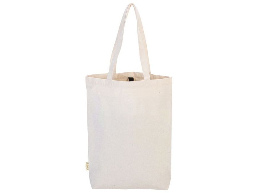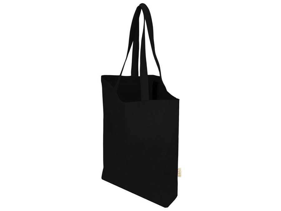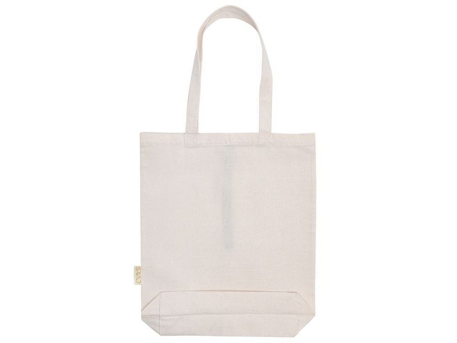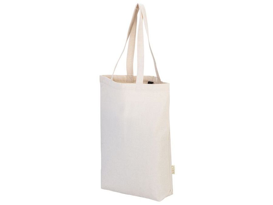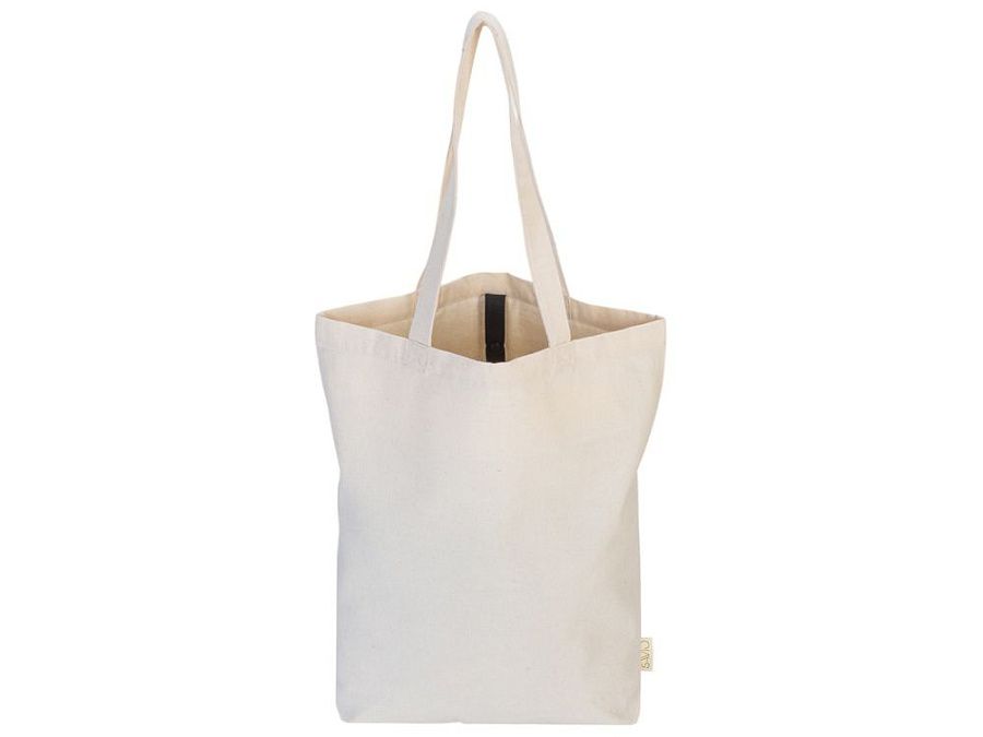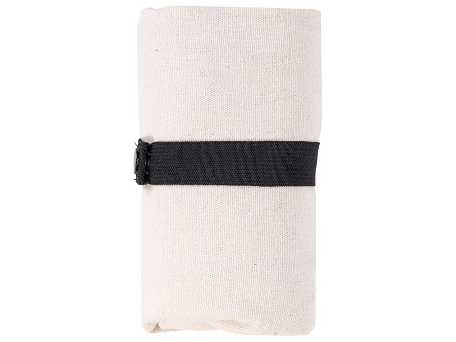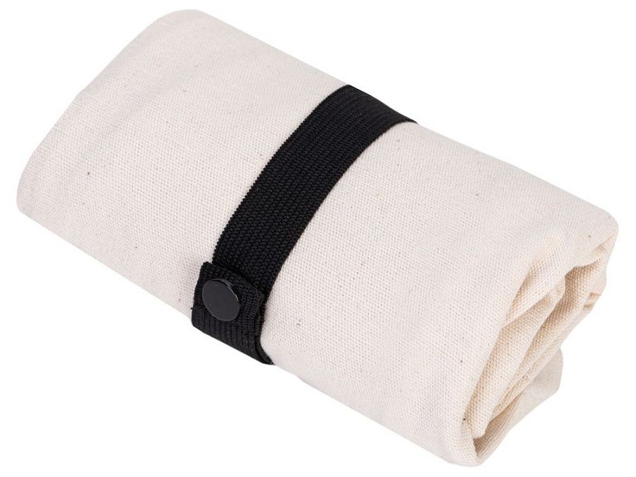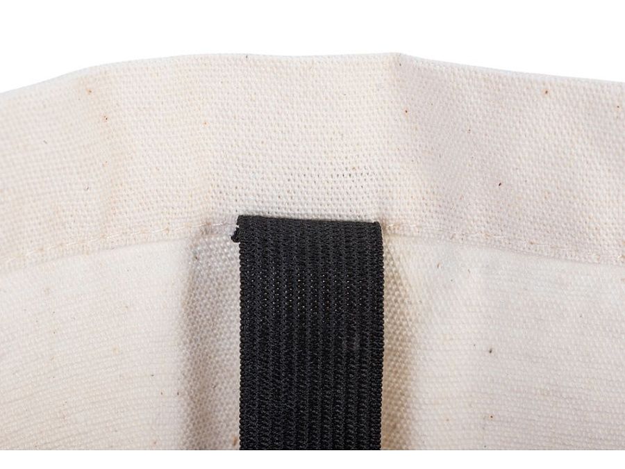 Удобная сумка-шоппер из переработанного хлопка. Можно хранить в сложенном виде и фиксировать с помощью эластичной ленты, застегивающейся на кнопку.