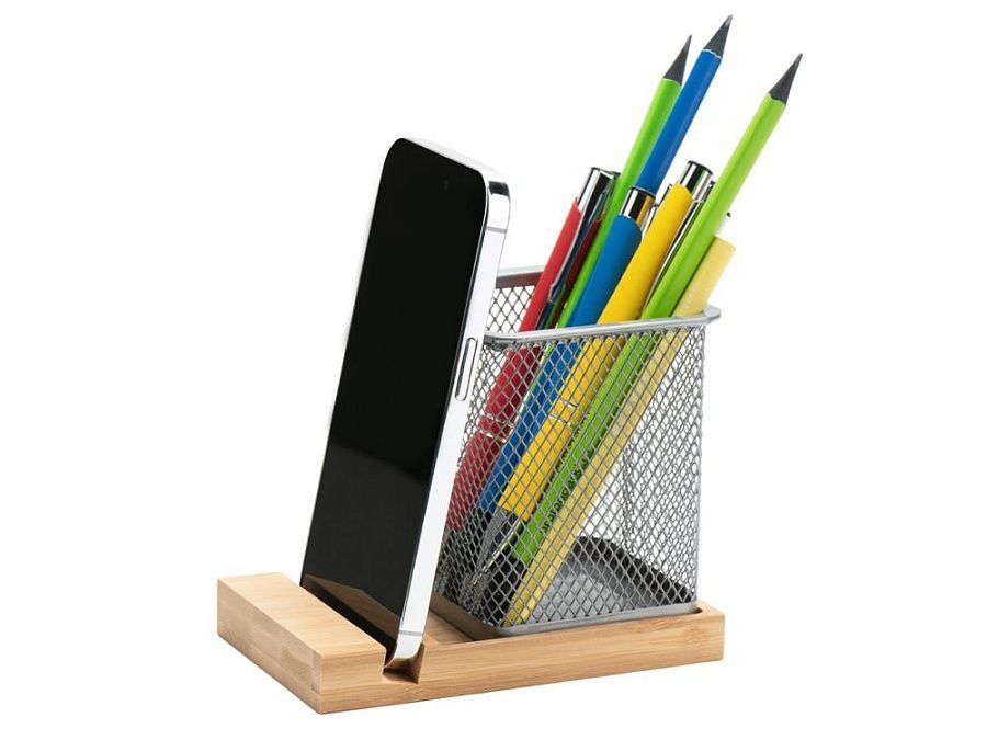 Особенностью бамбуковой подставки является небольшая выемка, в которую удобно можно установить телефон, чтобы он всегда был под рукой. Эта подставка гармонично сочетает стиль и практичность, добавляя уют и организованность в ваше рабочее пространство.