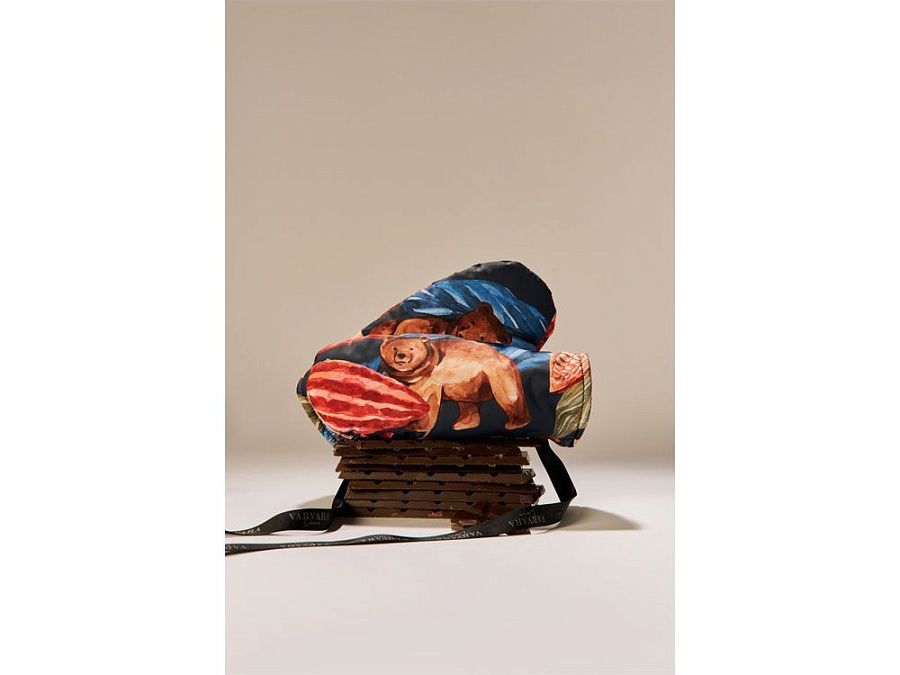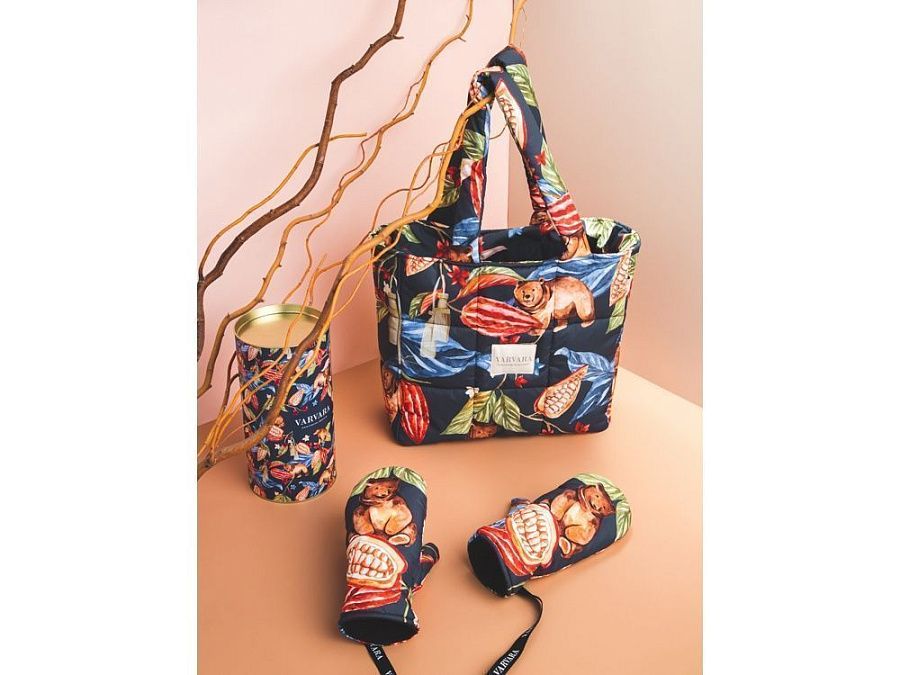 Принт «Мишки в шоколаде» продолжает серию сказочных принтов Varvara. Задорные медвежата прячутся в листьях и плодах вечнозеленого какао, создавая яркий, эмоциональный узор.