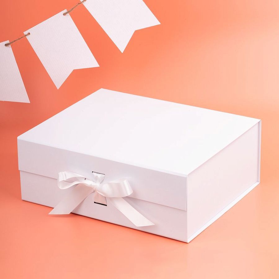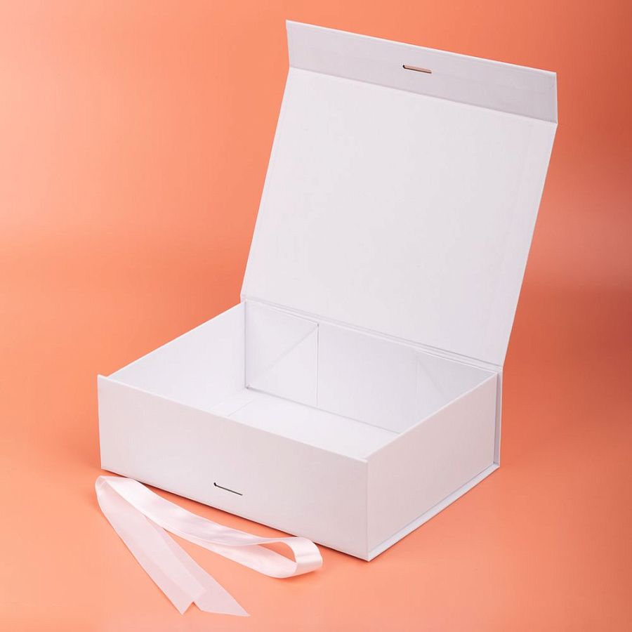 Коробка из переплетного картона, кашированного крафтовой бумагой. Крышка на двух магнитах дополнительно фиксируется лентой.Толщина картона 2 мм.