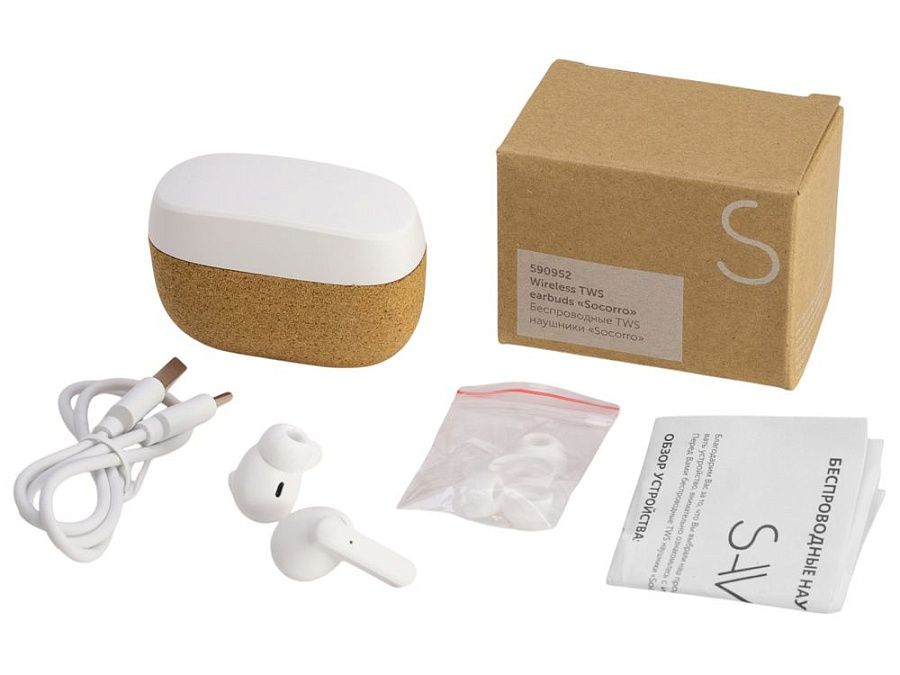 Стильные беспроводные наушники Socorro сочетают экологичность с передовыми технологиями. Изготовлены из переработанного ABS-пластика и натуральной пробки. Чипсет с поддержкой Bluetooth 5.0 обеспечивает качественную передачу музыки и стабильное соединение. Наушники предназначены для прослушивания музыки, но с ними можно ответить и на входящий звонок, нажав 1 раз на наушнике.