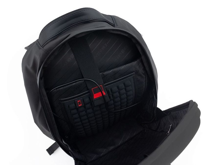 Рюкзак Eberhart Legacy для ноутбука – выбор стильного человека, который готов к экспериментам. Необычный дизайн аксессуара приковывает внимание. Рюкзак выполнен из черного полиэстера – прочного и надежного материала. Строгость формы и лаконичность оформления придает образу строгость. Размеры рюкзака позволяют с легкостью разместить ноутбук, документы и личные вещи. В качестве подкладки также используется полиэстер. Вся фурнитура подобрана в цвет рюкзака и потому модель действительно выглядит максимально сдержано.