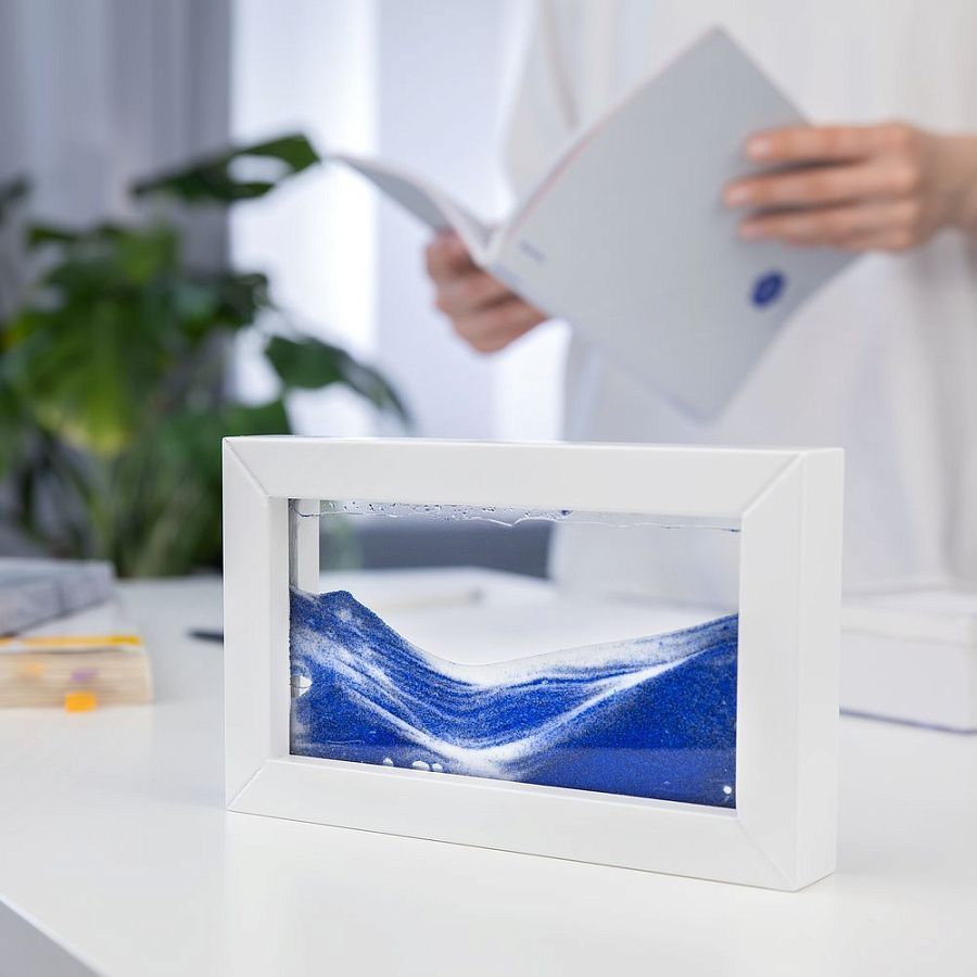 Песочный антистресс — это живая картина, в которой струящиеся в воде цветные песчинки создают неповторимые пейзажи. Наблюдение за невероятными образами позволит расслабиться и отвлечься от дел, успокоив глаза и мысли.