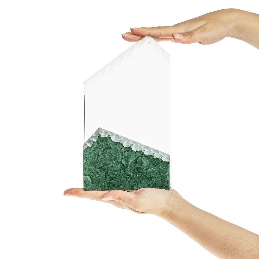 Помимо красивейшего змеевика, награда изготовлена из стекла К9, в основе которого лежит оптическое боросиликатное стекло. Эту марку стекла отличает низкий процент посторонних включений, высокий показатель преломления и высокая прозрачность — идеальные качества для изготовления наград премиального уровня.
