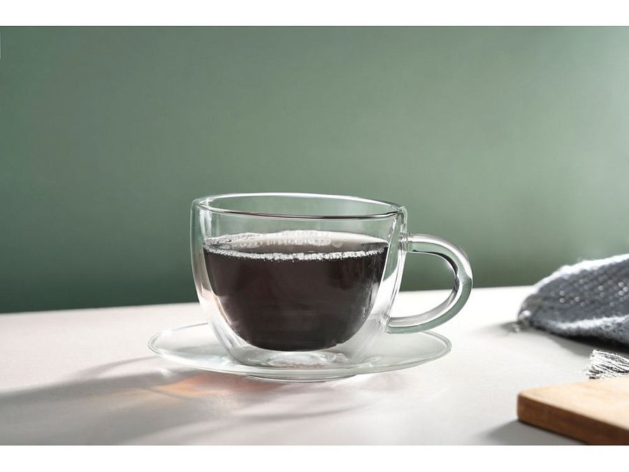 Изысканная чайная пара "Rio" – это гармоничное сочетание стиля и функциональности. Чашка с двойными стенками идеально подходит для наслаждения горячими и холодными напитками, а элегантное блюдце дополняет комплект, придавая ему особый шарм.