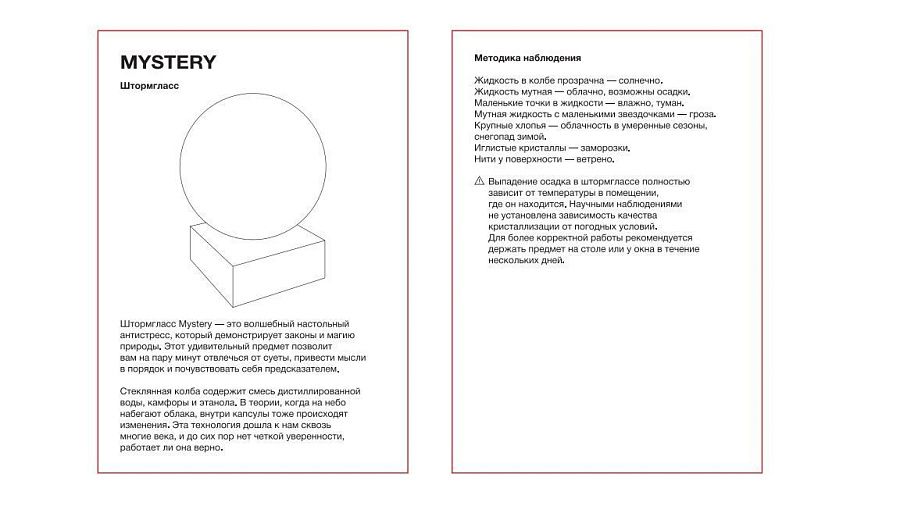 Штормгласс Mystery — волшебный настольный антистресс, который демонстрирует законы и магию природы. Этот удивительный предмет позволит на пару минут отвлечься от суеты, привести мысли в порядок и почувствовать себя предсказателем. Когда на небо набегают облака, внутри колбы со специальной жидкостью тоже происходят изменения.