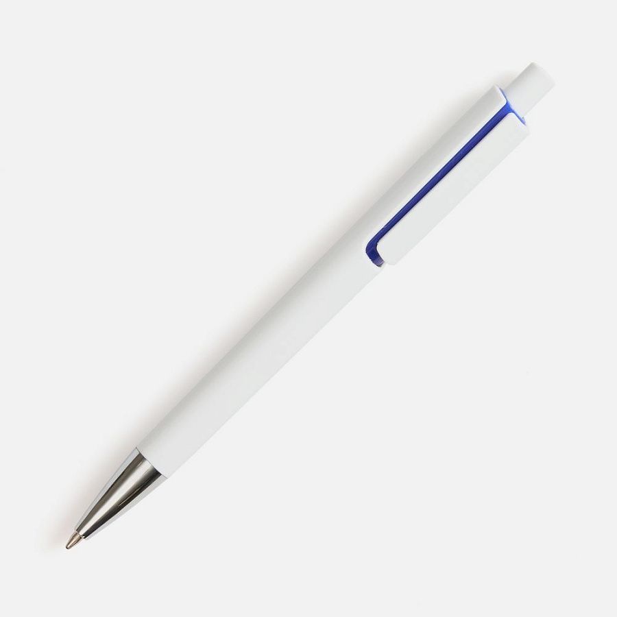 Шариковая ручка с глянцевым белым корпусом и цветовым акцентом у клипа, который дополнит логотип компании.