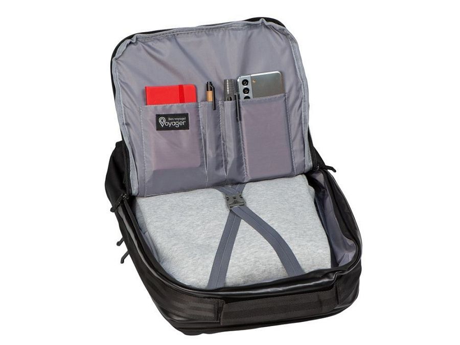 Удобный бизнес-рюкзак для передвижения по городу и деловых поездок состоит из отделения для ноутбука и планшета, большого отделения для одежды с фиксирующими ремнями, 2х наружных карманов на молнии спереди. Конструкция рюкзака продумана до мелочей: внутри большого отделения расположен органайзер для гаджетов и проводов, на спинке есть ремень для крепления на ручку чемодана и регулирующиеся по длине лямки, на лямке - карман для карт или ключей. Водостойкий материал и молнии. В комплекте мешок из спанбонда для хранения и металлический шильд под ваш логотип.