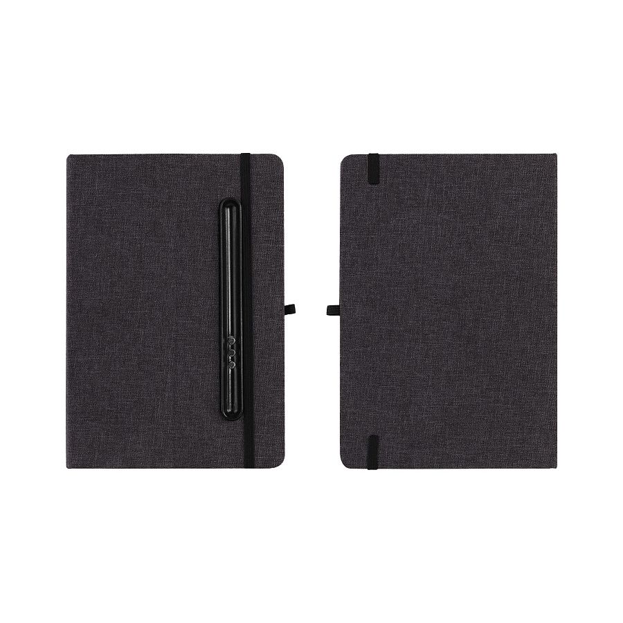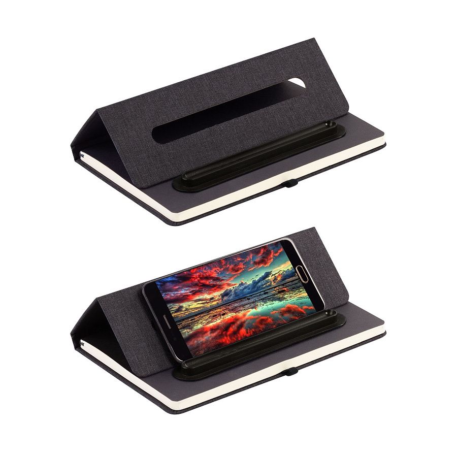 - Блокнот формата А5 с резинкой-фиксатором и встроенным в обложку магнитным держателем для ручки. Внутренний блок состоит из 160 страниц в линейку бумаги плотностью 70 г/м2. Материал обложки изготовлен из переработанного (RPET) пластика. Магниты прочно и надёжно закрепляют металлическую ручку на обложке. Бонус – обложка трансформируется в удобную подставку для смартфона/планшета/ноутбука;