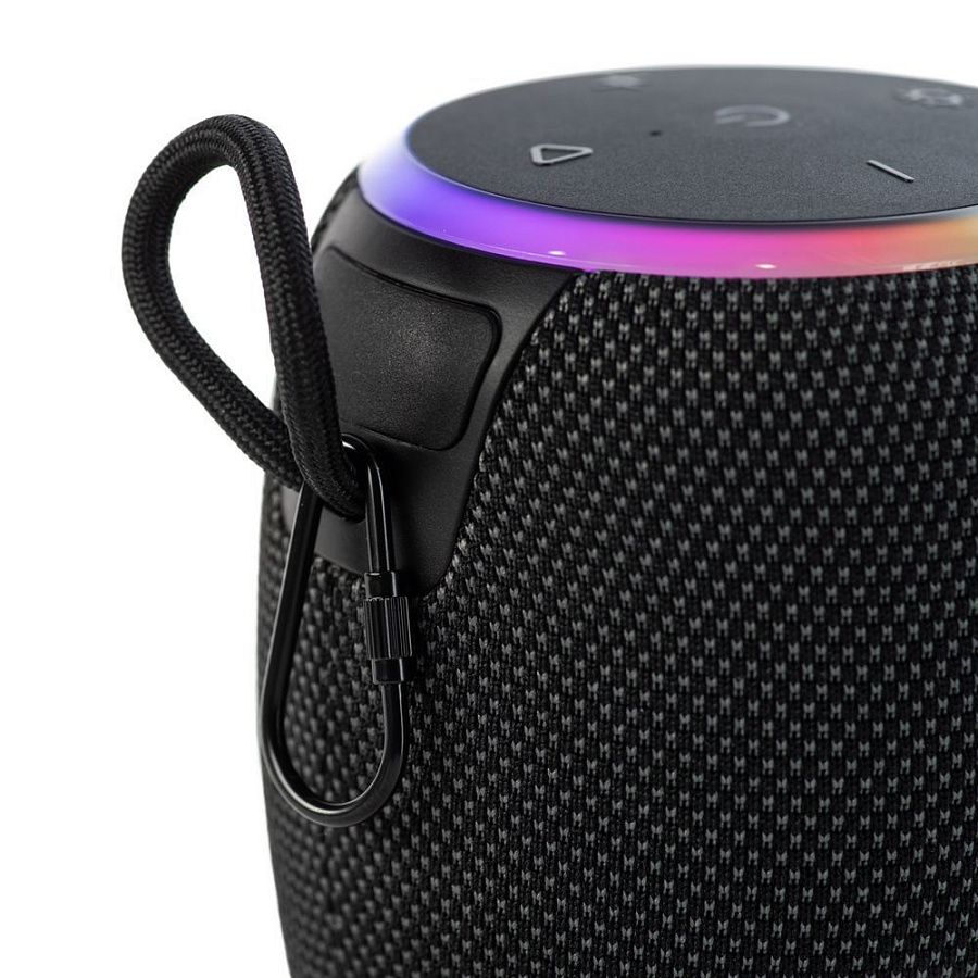 Небольшая, но мощная колонка с подсветкой и карабином.
